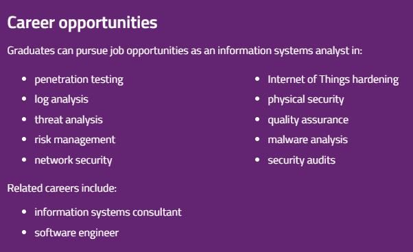 특히. 보안분야에서 무엇보다 가장 중요시 되는 부분이 Communication(의사소통) 이기 때문이기 때문에 국제학생으로서 관련 직종을 찾는건 굉장히 힘들다고 볼 수 있습니다. 일부 회사나 직종에서는 최소 영주권 혹은 시민권을 요하는 경우가 있기 때문에 학과 공부를 하시면서 제 2의 전공을 하나 찾으셔서 보안과 함께 그 2전공과 관련된 직군도 함께 구직활동하시면 보다 좋은 결과가 있지 않을까 싶습니다.