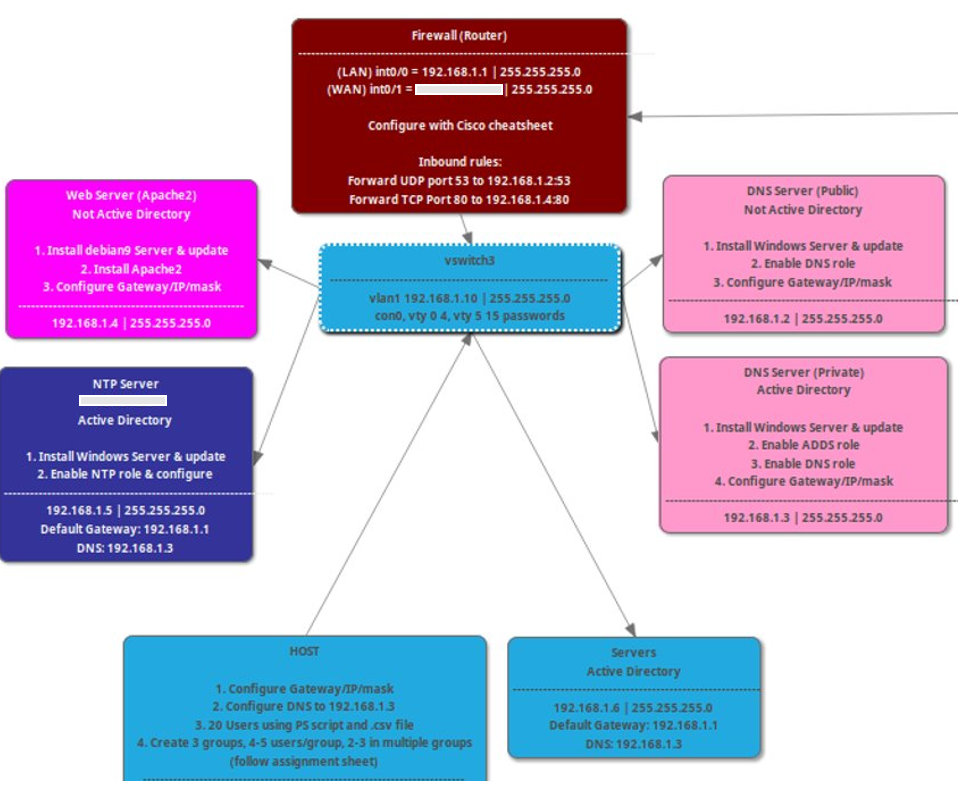 - 파이널 프로젝트: 가상 네트워크(방확벽, 라우터, 스위치, DNS, DHCP, Active Directory, Workstations 등)를 구축합니다.