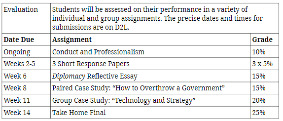 위에 언급한 책 관련 전략 에세이, Diplomacy 보드게임 전략 에세이, 최종 에세이 등 에세이를 기반으로 평가가 이루어 집니다.