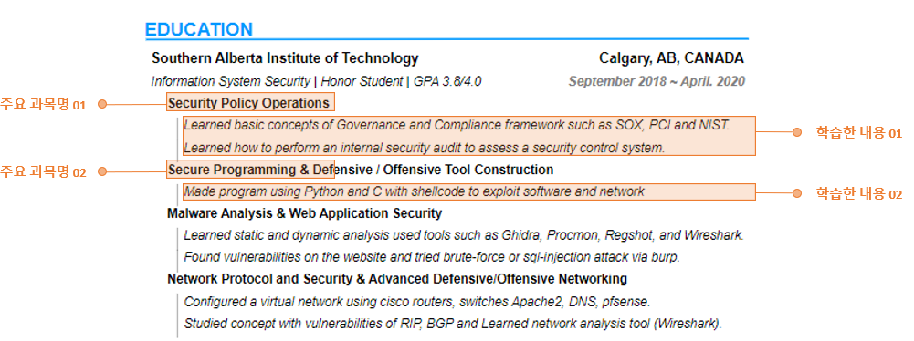 필요한 내용은 [학교 이름, 학교 위치, 전공, (학점), 기간, (주요과목 및 배운내용)] 정도입니다.