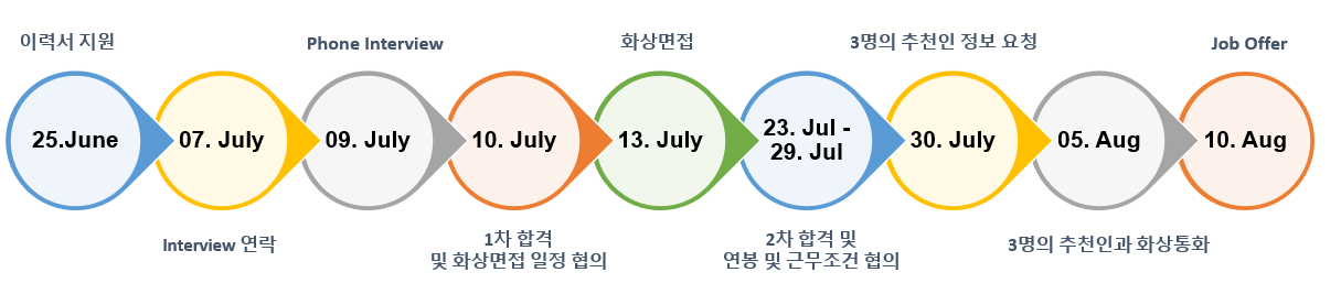 이 글을 포스팅 하면서 TimeLine을 정리해보니 이력서 지원은 2020년 6월 25일에 했고, Job Offer는 6주정도가 지난 8월 10일에 받을 수 있었다.