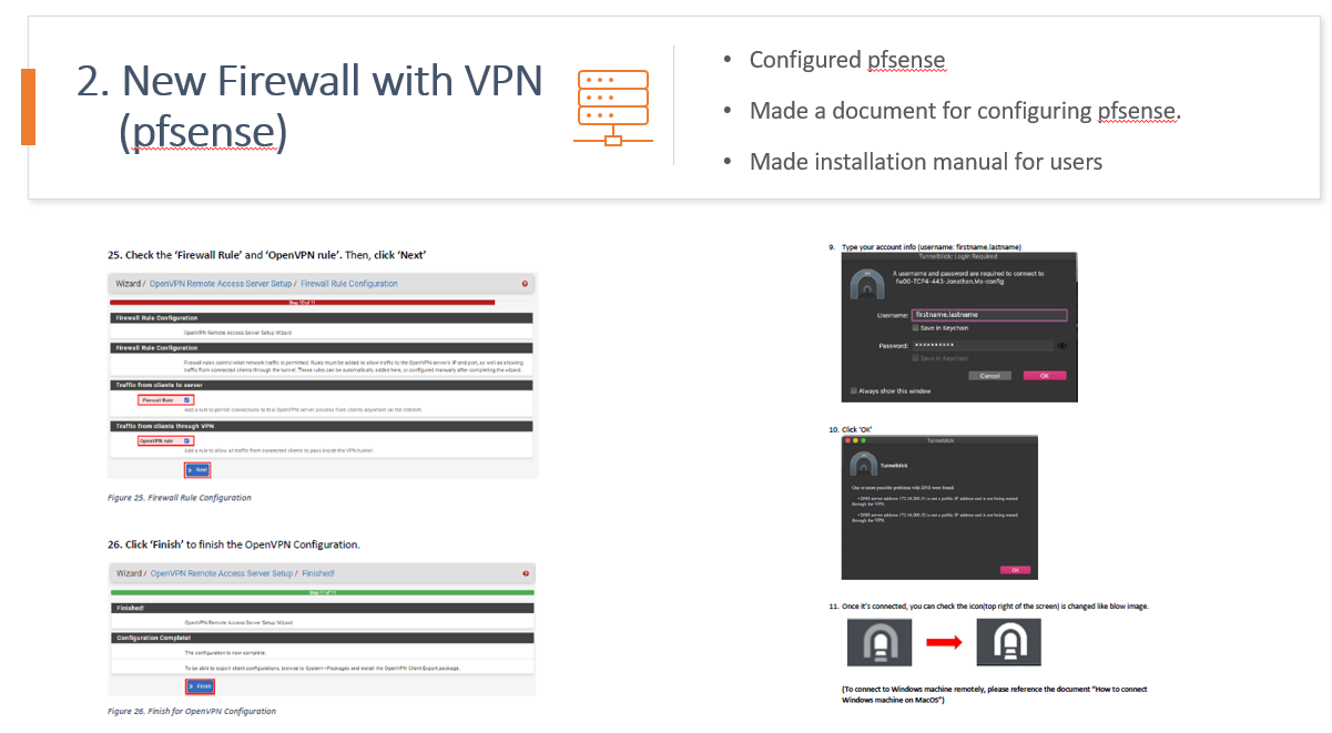 추가적으로, 과정 하나하나를 문서로 기록하면서 셋팅 과정을 문서화 시켰고, 유저들을 위한 VPN 이용방법 메뉴얼도 제작하였습니다.