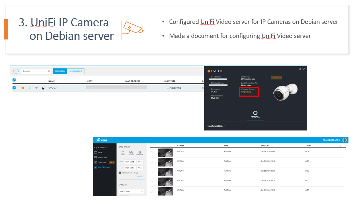 회사 내에서 사용하고 있는 UniFi IP Camera들을 관리 할 수 있는 UniFi Video server를 가상서버에 셋팅하는 프로젝트였습니다. Ubuntu와 Debian 두 버전을 통해 만들었고, 매니저가 Debian을 더 선호하였기 때문에 최종적으로 사용되는 서버는 Debian 서버에 설치한 UniFi Video Server 였습니다.