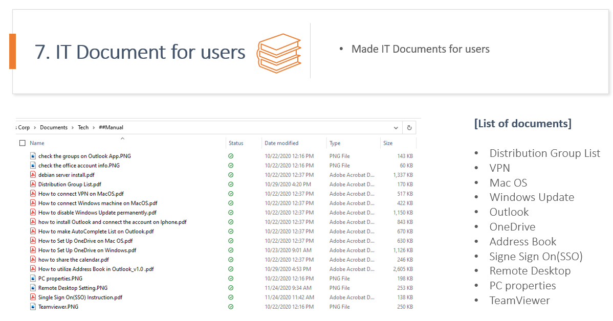 대표적으로 Outlook, OneDrive, SSO, Distribution Group, Address Book 등 Microsoft O365와 관련된 문서들이 많았고, 그 이외에도 VPN 연결, 원격 데스크탑 연결, PC 정보 확인, TeamViewer 및 원격프로그램 이용 관련 메뉴얼을 제작하였습니다.