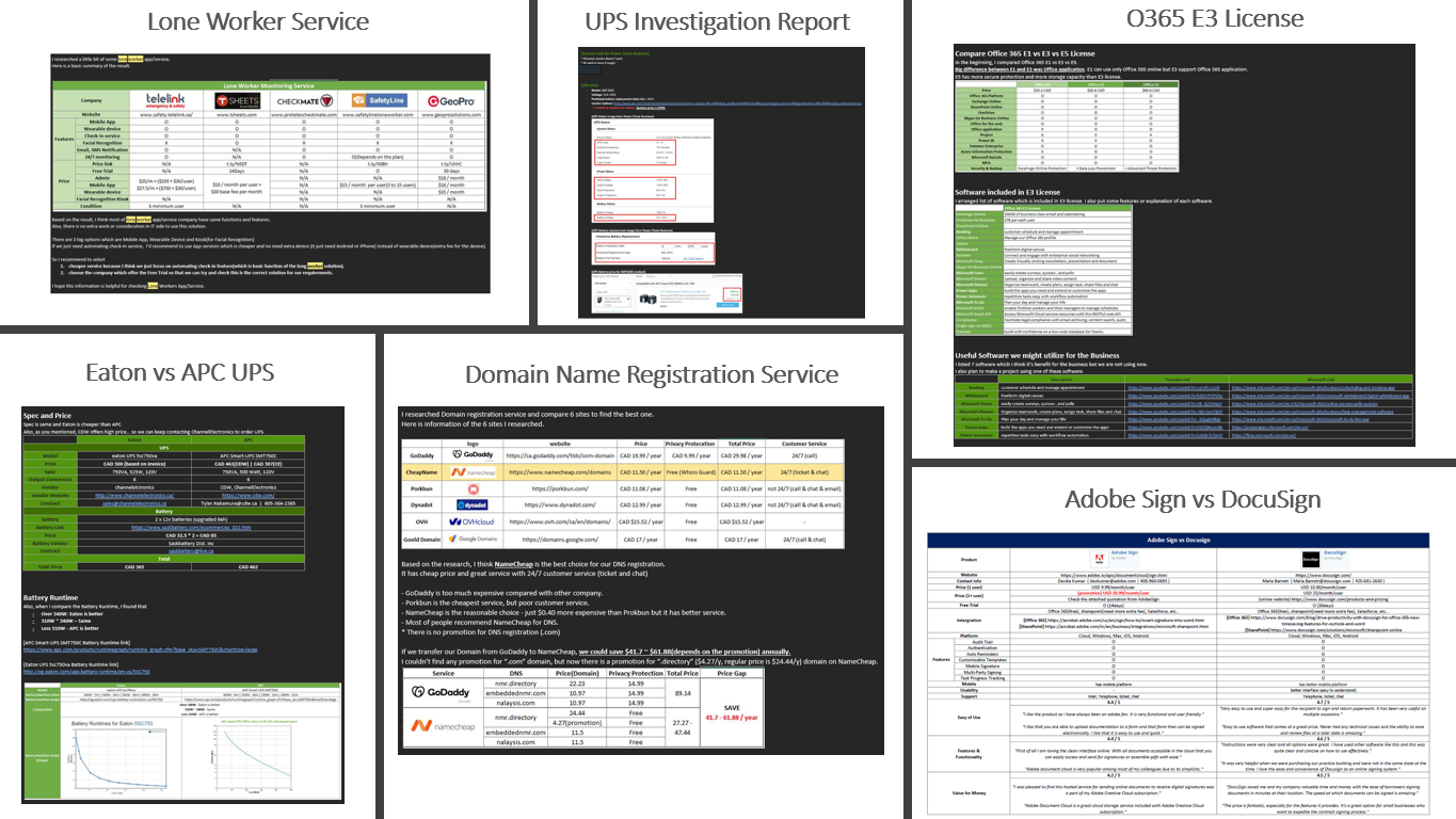 [Research List] O365 E3 License, Domain Name Registration Service, UPS Investigation, Eaton vs APC, Adobe Sign vs DocuSign, Lone Worker Service, SharePoint, New Server for HCI.