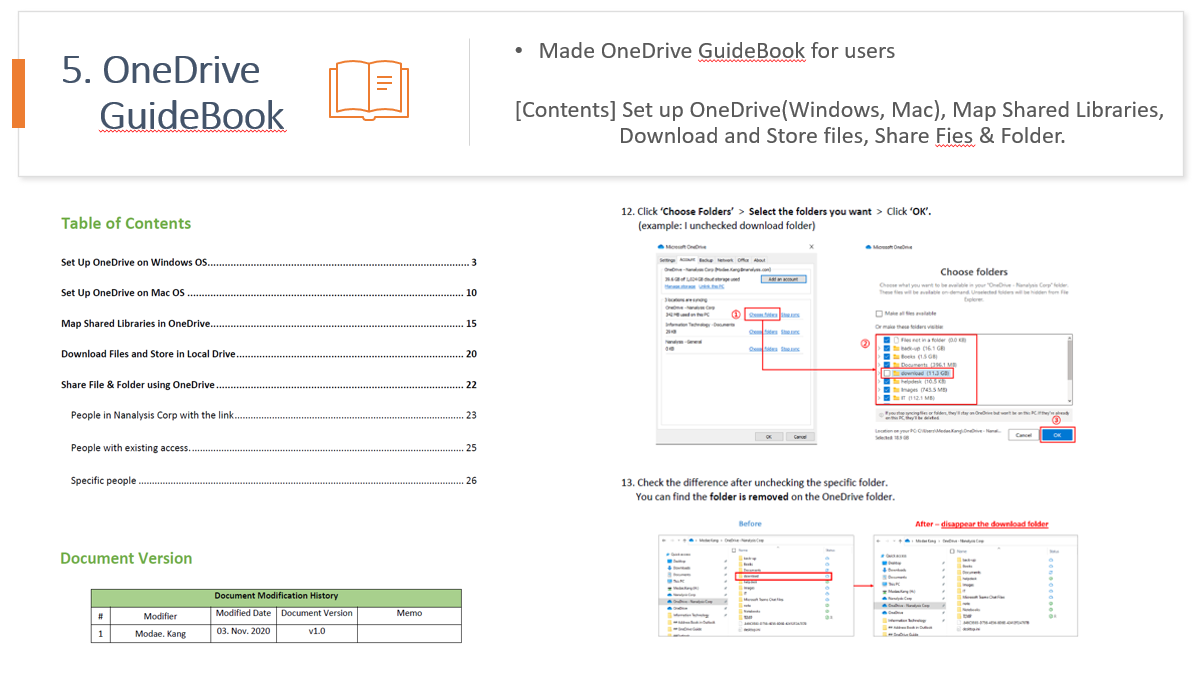 이러한 문제를 방지하고자 OneDrive GuidBook을 만들게 되었고, 이 문서는 기본적인 OneDrive 셋팅(Windows & Mac OS), 공유 라이브러리 맵핑, 파일 및 폴더 다운로드 방법, 파일 공유 방법 등으로 구성하였습니다.