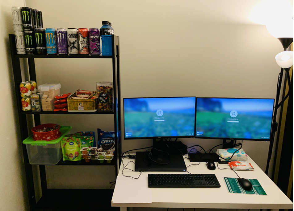 그래서 차선책으로 만든 재택근무 환경은 작은방에 사무실을 만드는 거였다. 옆에 선반에 음료수와 과자 등 업무하면서 간간히 먹을 수 있는 여러 간식들도 다 이곳으로 옮겼다. 다 옮기고 셋팅하고 보니 최고의 재택근무 공간이 아닌가 싶다.