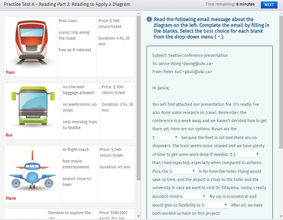- 지문 유형: 왼쪽에는 비교대상들에 대한 이미지 및 설명이 있는 지문. 오른쪽에는 문제가 섞인 이메일형태의 지문.