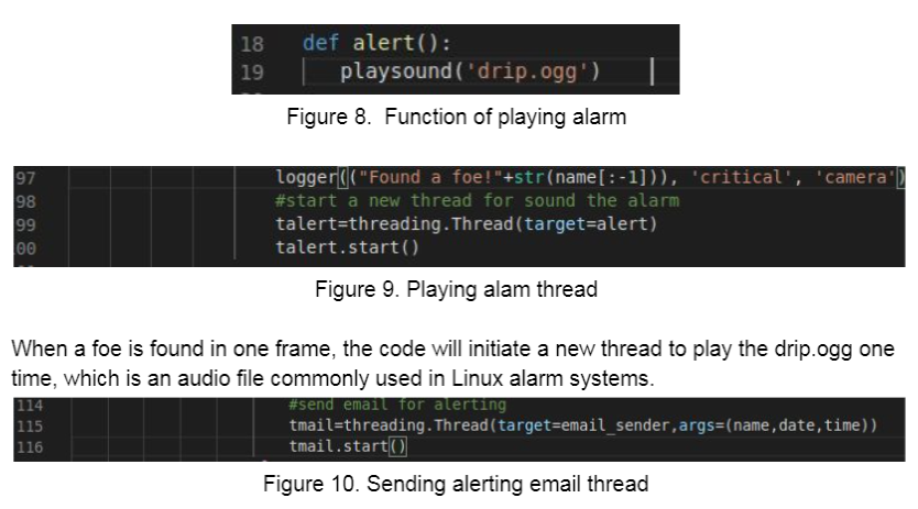 적이 발견되었을때, 경고 메시지를 보내기위한 thread가 생성되면서 갑작스레 얼굴 인식 기능이 중단되는 현상이 발생했습니다. 이 문제는 파이썬 multithreading 모듈을 구현함으로써 해결되었습니다.