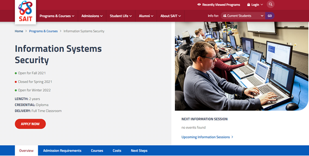 캐나다 대학의 IT보안 관련 학과는 주로 3년제 혹은 4년제로 개설돼왔는데, IT보안 인력 수요가 급증하면서 지난 2017년 캐나다 앨버타 주의 대학 SAIT (Southern Alberta Institute of Technology: 남부 앨버타 공과대학)는 2년제 IT보안 학과를 신설했다.