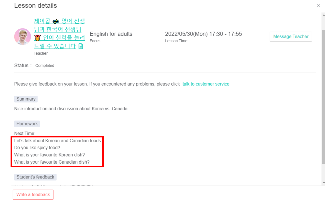 또한, 사전에 튜터와 개인 메시지를 주고 받으면서 수업과 관련해 개인적으로 튜터에게 궁금했던 부분을 미리 확인받고 수업을 수강할 수 있습니다. 제가 실제로 강의 때 했듯이, 제가 생활하고 있는 나라에 대한 문화 이해, 혹은 제가 이 나라에 살면서 조심해야하는 부분들에 대해 이야기를 나눌 수 있어서 영어와 동시에 생활정보 그리고 나라의 문화에 대해서도 배울 수 있는 1석 2조의 효과를 누릴 수 있습니다.