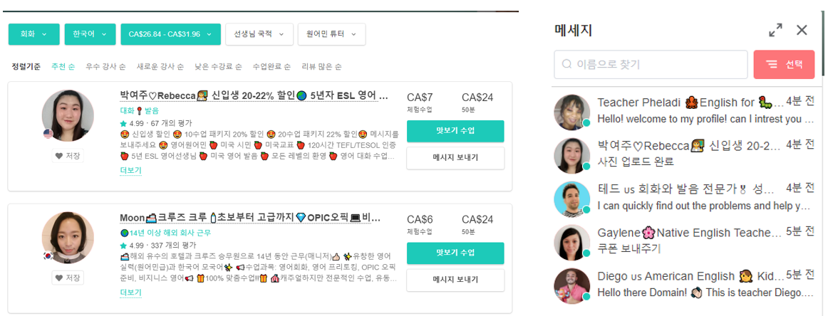 튜터를 선택하는 과정에서 튜터들과 개인 대화를 통해서 현재 상황과, 수업방식에 대한 질문을 주고 받을 수 있었습니다. 이러한 부분은 결제하기 전에 내가 원하는 대로 수업이 진행될 수 있는지를 비롯해 수업과 관련된 궁금한 사항들을 결제 전에 확인하고 체크할 수 있다는점에서 좋았습니다.