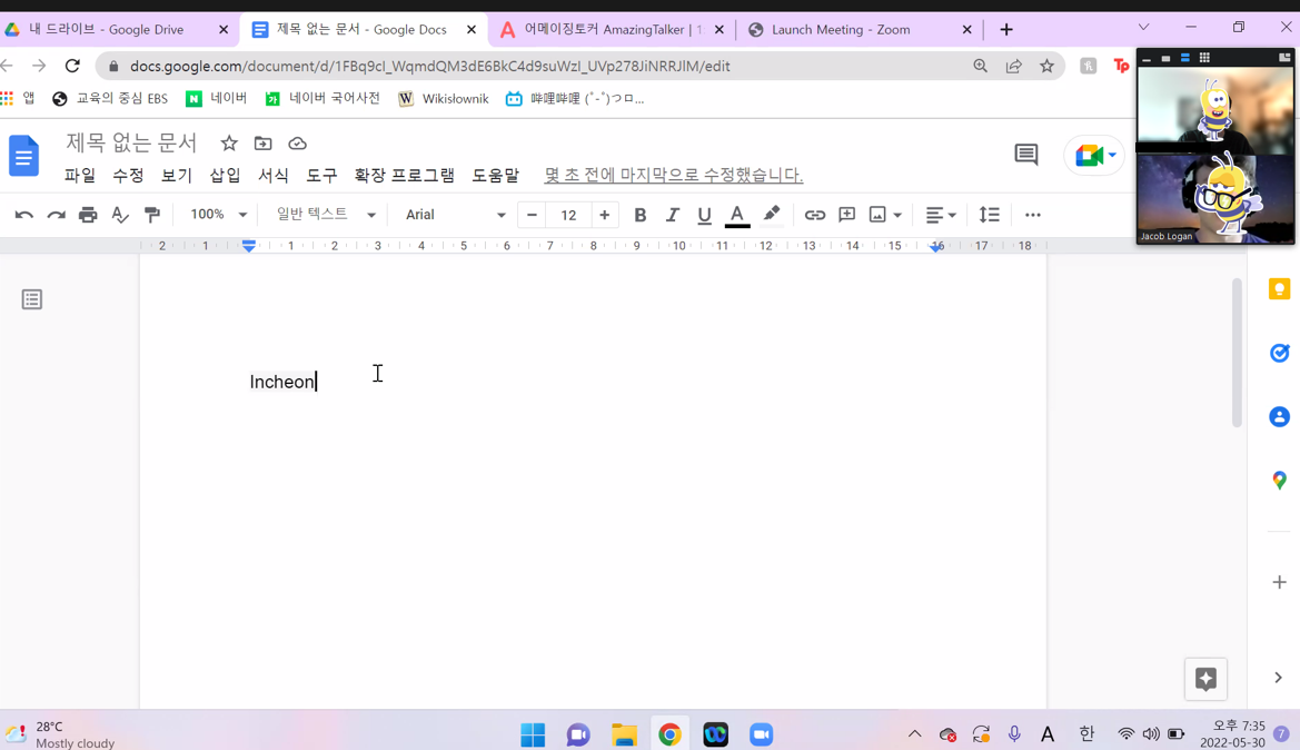 그리고 제이콥 선생님의 등장! 확실히 튜터 경험이 있어서 그런지 먼저 질문도 해주시고 말을 걸면서 수업을 매끄럽게 잘 이끌어 나가주셨고, 막연하게 '영어회화'를 하고 싶다 라는 생각만 갖고 들어갔던 수업이였지만, 제이콥 선생님께서 사전메시지를 통해 제가 흥미를 가질 만한 여러가지 주제들을 제시해주시면서 자연스러운 수업 진행이 가능했습니다. 첫 시간이였기 때문에 간단한 소개와 현재 살고 있는 도시에 대한 이야기, 한국에 대한 이야기 그리고 어떤 수업을 듣고 싶은지에 대한 이야기 등등 앞으로 수업방향을 어떻게 진행할지에 대한 이야기를 주로 다루었습니다.
