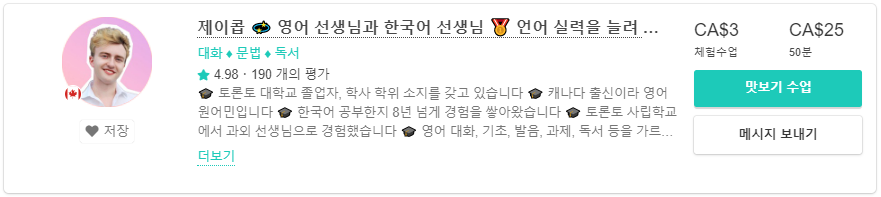 저는 제이콥 튜터 수업을 신청했습니다. 한국말을 할 수 있는 사람을 원했고, 캐나다 문화에 대해서도 잘 아는 튜터를 원했고, 제이콥 튜터는 딱 제가 원하는 조건을 갖춘 튜터라는 생각에 체험 수업을 신청했습니다.