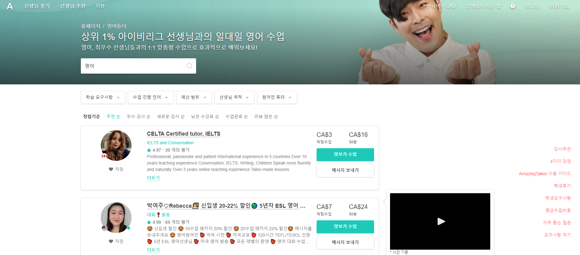 그에 반해 어메이징토커는 링글에 비해 저렴하면서도, 수많은 튜터들이 존재하고 일상회화, 비지니스 회화에 초점을 맞춰 접근하면은 좋겠다라는 느낌을 받았습니다. 물론 IELTS와 같은 시험을 전문으로 하시는 튜터들도, 어린아이들 영어교육을 전문으로 하는 튜터도 있었습니다.좀 더 많은 사람들이 튜터로 활동할 수 있기 때문에 다양한 튜터를 만날 수 있는 기회가 있다는 것이 큰 장점이라는 생각이 들었습니다. 물론, 자신에게 맞는 튜터를 찾기까지는 시간이 걸릴 수 있겠지만, 저렴한 체험수업을 통해 튜터들과 화상영어를 진행해 볼 수 있다는 점이 매력적이라는 생각이 들었습니다. 개인적으로는 가입하자마자 큰 돈을 결제하기 보다는 소액으로 여러 튜터들과 체험수업을 진행해본 뒤에 자신에게 맞는 튜터가 나왔을 때 큰 금액을 결제하는 식으로 하는것이 어메이징토커 플랫폼을 가장 합리적으로 활용하는 방법이라 생각됩니다.