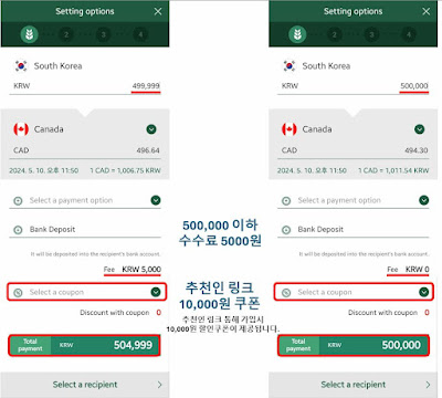 3. 그럼 아래와 같이 얼마의 금액을 송금할지 선택할 수 있는 화면이 나오고, 아래 이미지에서 보시다 시피 500,000원 이상 송금건에 대해서만 수수료가 0원이고 그 이하는 5,000원이 드는것을 확인할 수 있습니다. 그러니 최소 500,000원 이상씩 환전을 진행하시는게 좀더 비용을 아끼기 좋습니다! 환율확인하신 뒤, 위의 링크를 통해 가입 후 받으셨을 10,000원 쿠폰도 잊지말고 이용해주세요.
